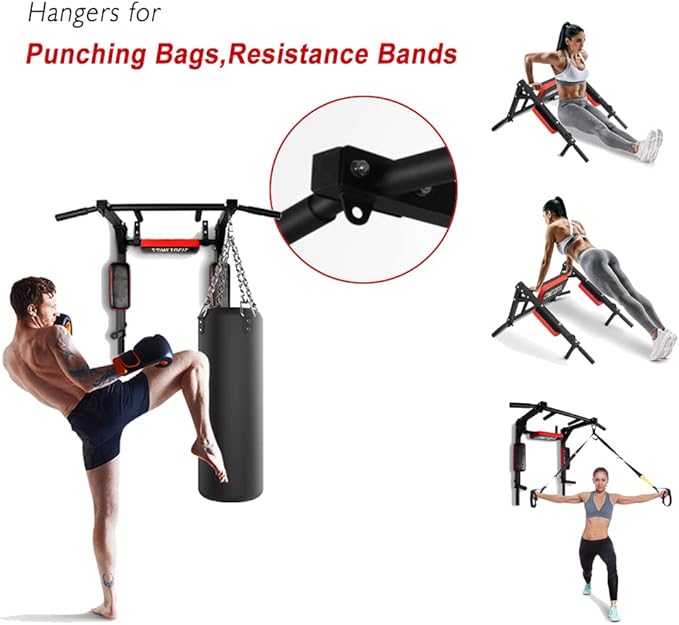 - Multifunctional Fitness Machine: This multifunctional wall mounted pull up bar can support many kinds of sport exercise like pull ups, chin ups, dip station, leg raises and boxing. Perfect for exercising your backs, shoulder, chest, arms, triceps, biceps, lats, and the front of your abs.