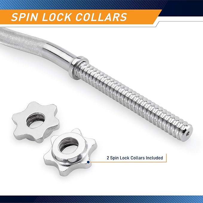 - SAFETY SPINLOCKS – You can forget about unstable plates when training. This triceps curl bar features threaded spinlock collars that attach firmly onto its end to secure free weights and prevent them from moving when you exercise.