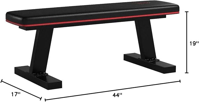 • MAX CAPACITY OF 600 LBS – The maximum user weight capacity of this flat bench is 300 pounds minus the weights. It has dimensions of 44 (L) x 19 (W) x 17 (H) inches, meaning that it can be used for a variety of workouts.