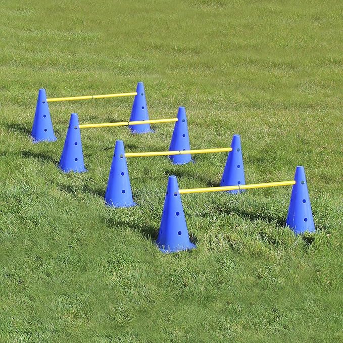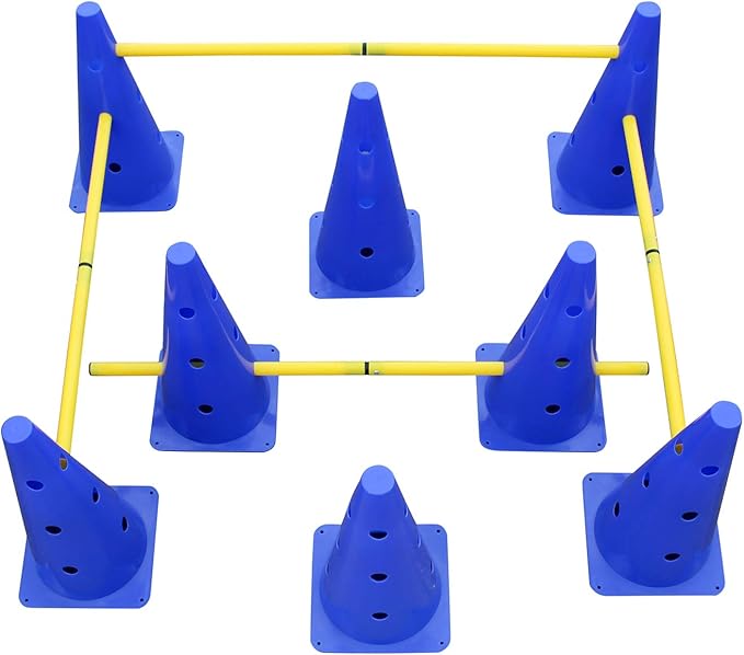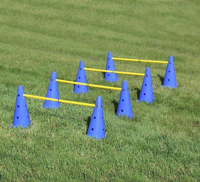 - [Adjustable Hurdle Heights] Traffic cones features 3 hole heights to adjust the hurdle size; Easily adjust the height to 4.5 inches, 9.5 inches, or 14 inches off the ground by moving the hurdle rod to a different height on the cones with holes