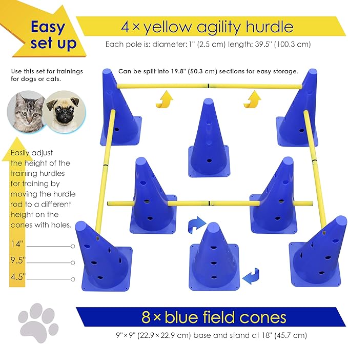 - [Convenient Storage] Each dog training set includes 8 blue practice cones, 4 yellow hurdle poles, and a large storage bag; Yellow poles split into 19.8-inch sections and cones stack to make transportation easier