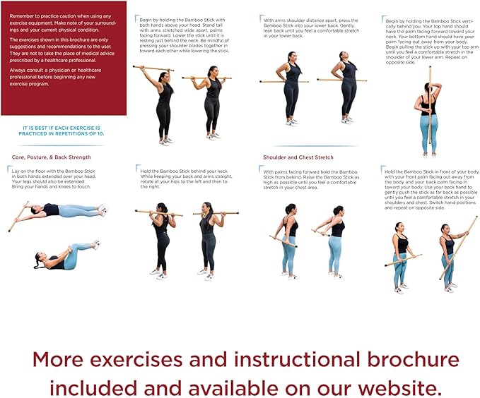 • Durable smooth bamboo with 1.25 inch thickness for easy griping. Improves range of motion by enhancing your stretching and relieving tension and tightness. Lightweight, each stick weighing less than 3 lbs.
