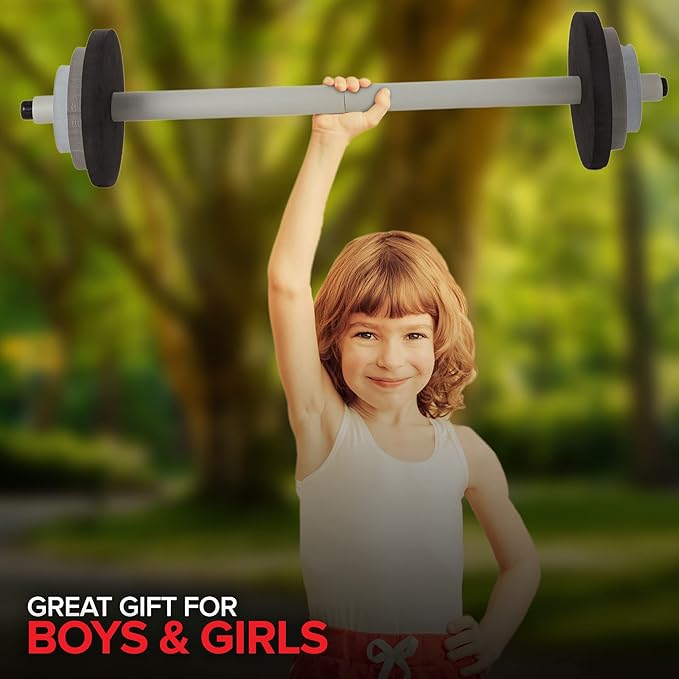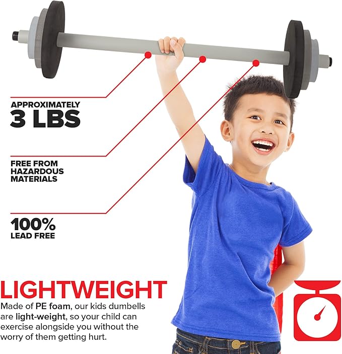 - Safe for Your Toddler: Made of PE foam, our kids barbells are 100% lead-free and free from hazardous materials. They're light-weight, so your child can exercise alongside you without the worry of them getting hurt. Barbell weighs about 3 lbs.