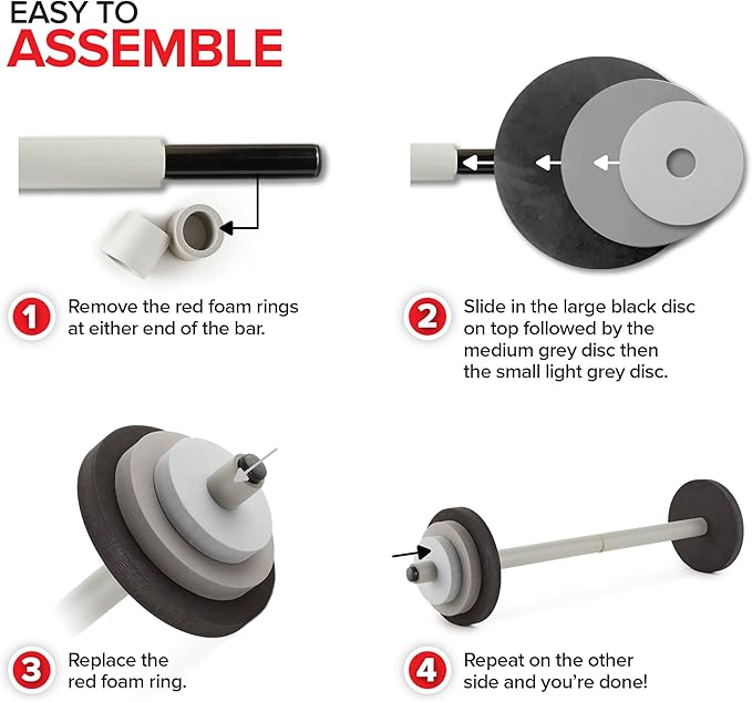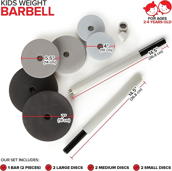 - Easy to Assemble: All you have to do is slide a large black disc into either side of the bar. Then slide in the medium-sized gray disc, and finally the small gray disc. Repeat on the other side. Our barbells make great gifts for boys and girls.