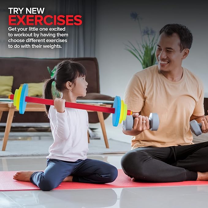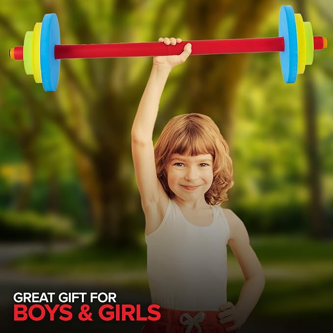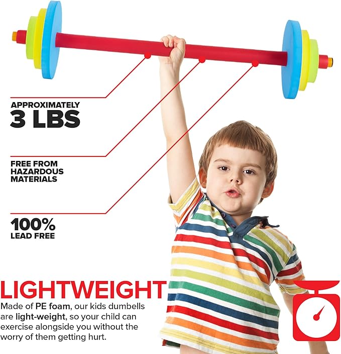 - Safe for Your Toddler: Made of PE foam, our kids barbells are 100% lead-free and free from hazardous materials. They're light-weight, so your child can exercise alongside you without the worry of them getting hurt. Barbell weighs about 3 lbs.
