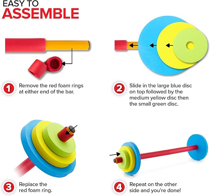 - Easy to Assemble: All you have to do is slide a large black disc into either side of the bar. Then slide in the medium-sized gray disc, and finally the small gray disc. Repeat on the other side. Our barbells make great gifts for boys and girls.