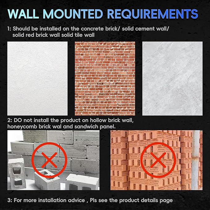 - 💪【Installation Notes】Ideal surfaces for mounting this pull-up bar include concrete brick, solid cement walls, solid red brick walls, solid tile walls, and solid wood thicker than 2.36 inches. ⚠️Please avoid installing on hollow brick walls, honeycomb brick walls, drywall, or sandwich panels⚠️.