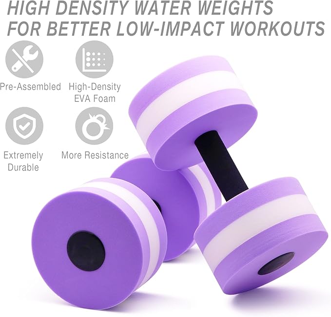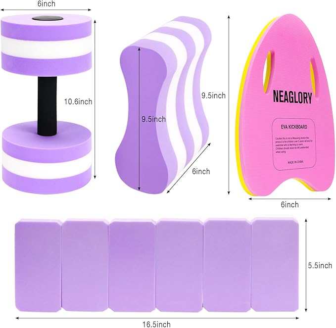- Aquatic Exercise Equipment: This combo set has all the essential tools you need for aquatic exercise. It includes 2 high-density EVA foam water weights, 1 swimming belt, 1 swimming pull buoy, 1 swimming kickboard.