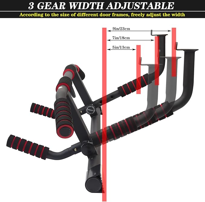 - ✅【Check Your Door Frame】: Newan door pull up bar for doorway can fit all doors, It can fit a door width of 20”- 41” and depth of 9” (23 cm), It holds up to 450 lbs (200kg).Door frame pull up bar uses leverage to hold against the doorway.
