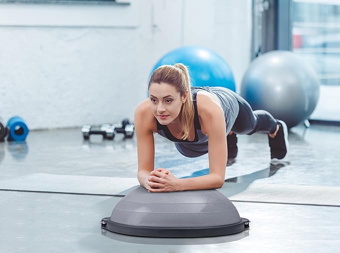 - placing the flat side down to practice stability. You can advance your routine by doing squats, lunges, or step-ups on the ball. Take it even further by flipping the ball over to use while doing push-ups, planks, or burpees. Included are removable resistant bands that can attach to the sides of the ball. They aim to tone and strengthen your upper body.