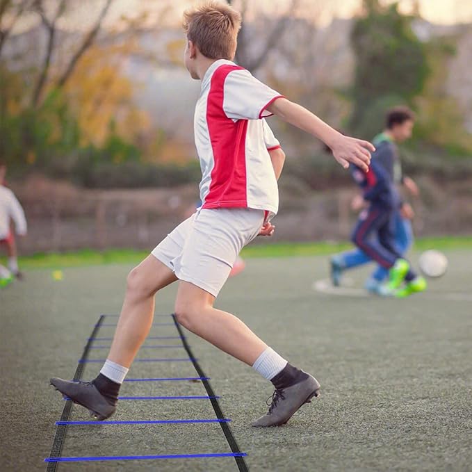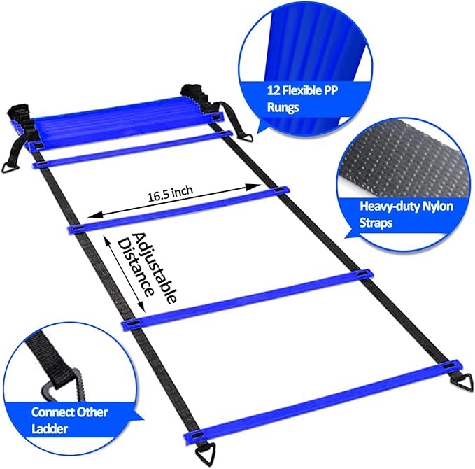 • 【AGILITY LADDER WITH FLEXIBLE DESIGN】This speed ladder crafted with high-quality PP material designed to last for years of use and training. It is flexible and adjustable, the space between rungs is adjustable up to 15" inch. You can simple adjust it in the nylon straps and secure it in place with rust-resistant metal pegs so as to meet your workout demands