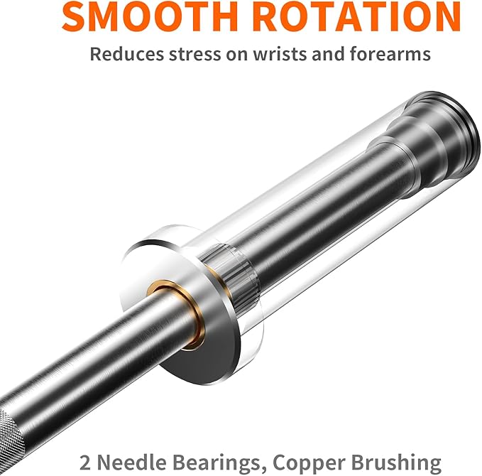 - SMOOTH & EXCELLENT SPIN: Snap rings on both ends of the barbell provide lifetime stability, and there are premium 2 oil-impregnated brass bushings in each sleeve. The 10" sleeves spin smoothly, allowing for fluid movements during exercises like cleans and snatches.