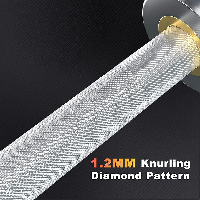 - Size of weightlifting bar: Total length 59in, sleeve length 10.5in, grip diameter 28mm, sleeve diameter 2in, the grip part is designed with 1.2mm diamond knurling to increase friction and effective anti-skid. Improve safety during exercise.