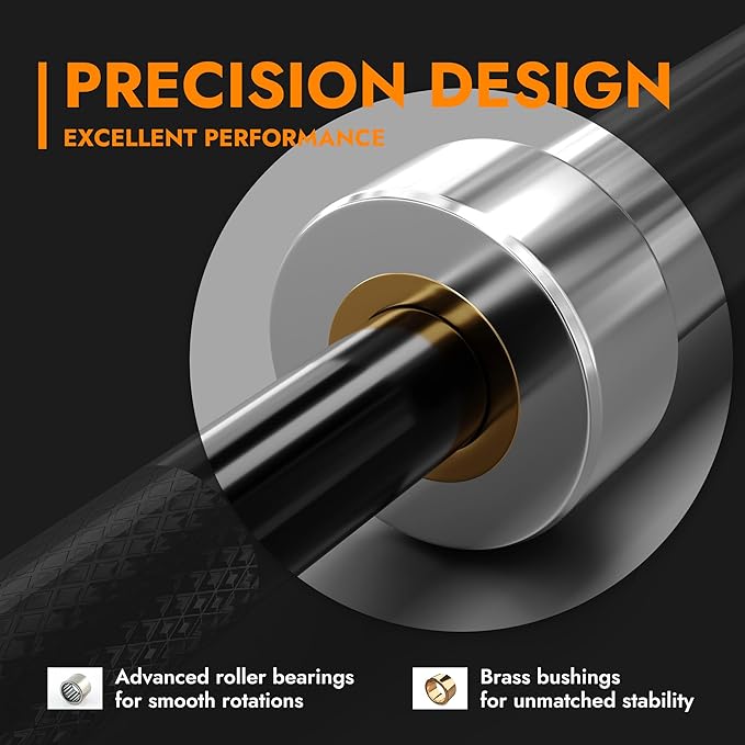 - Enhanced Performance with Precision Design: Equipped with smooth-rolling needle bearings and brass bushings, this Olympic barbell guarantees seamless, efficient movements during your lifts. The 1.2mm knurling on the grip provides an optimal balance of grip and comfort.