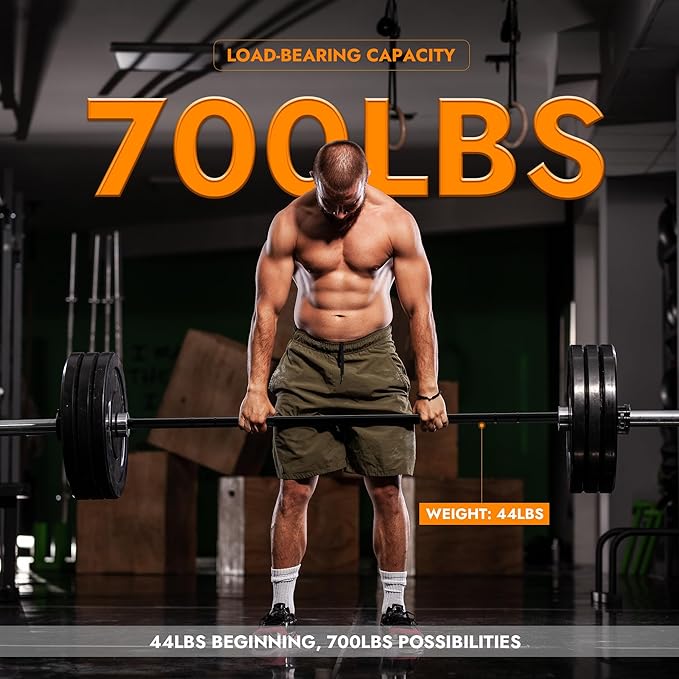 - Premium Olympic Barbell: Experience excellence with our 7ft Olympic barbell, meticulously designed for performance. This barbell, weighing 44lbs, ensures exceptional durability while accommodating up to 700lbs of weight.