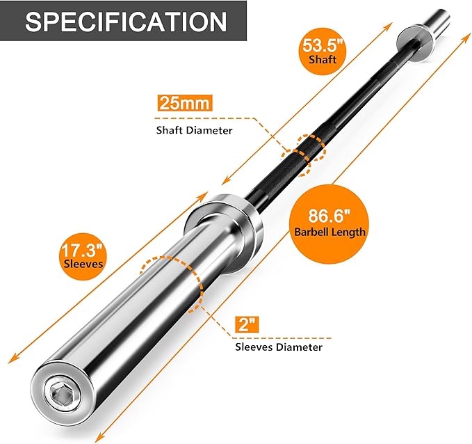 - Optimal Performance: Designed for serious athletes and fitness enthusiasts, this Olympic barbell offers superior performance. With a length of 7 feet, it provides ample space for a wide range of exercises, allowing you to target various muscle groups effectively.