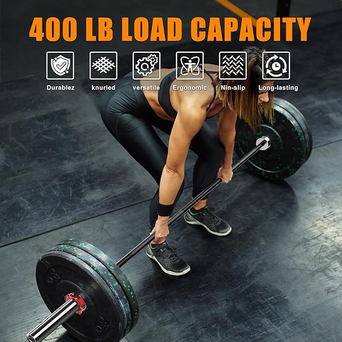 - Heavy-Duty Capacity: Engineered to support up to 400lb, this barbell is capable of handling heavy loads with ease. Whether you're deadlifting, squatting, or bench pressing, you can trust in its robust construction to provide stability and safety during your lifts.
