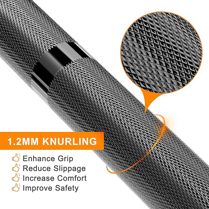 - Enhanced Grip: Featuring knurled handles, this barbell ensures a secure grip, even when your hands are sweaty. The textured surface helps prevent slippage, allowing you to maintain control and focus on your form throughout your workout.