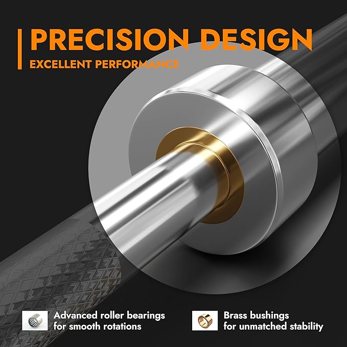 - Enhanced Performance with Precision Design: Equipped with smooth-rolling needle bearings and brass bushings, this Olympic barbell guarantees seamless, efficient movements during your lifts. The 1.2mm knurling on the grip provides an optimal balance of grip and comfort.
