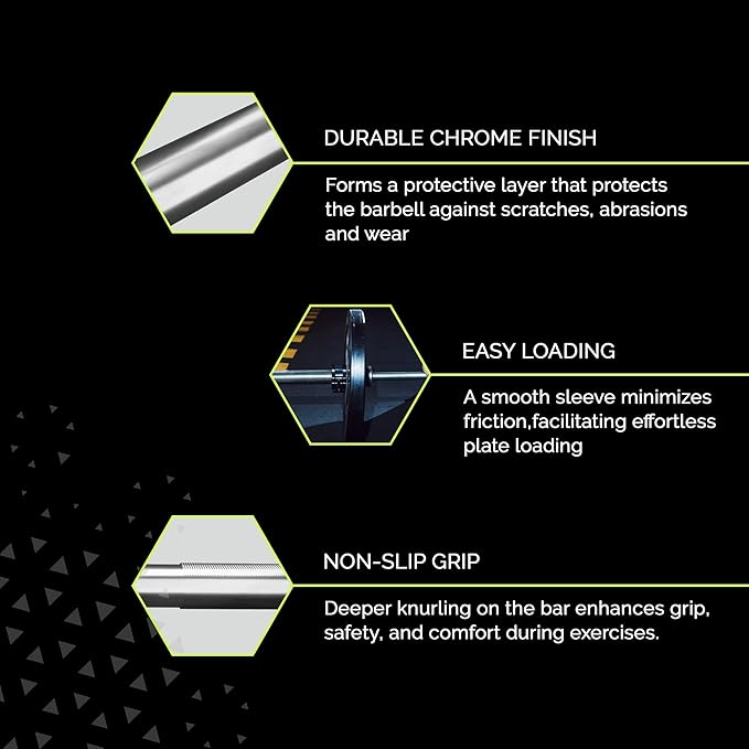 - 【 ERGONOMIC DESIGN 】: Our weight-lifting equipment features a comfortable grip area of 49 inches with 1.5mm deep diamond-knurled handles that provide a secure and non-slip grip during intense training sessions. The shaft and sleeves have a durable chrome finish that provides protection against corrosion and oxidation over time, as well as a stylish look in your professional gym or home gym.