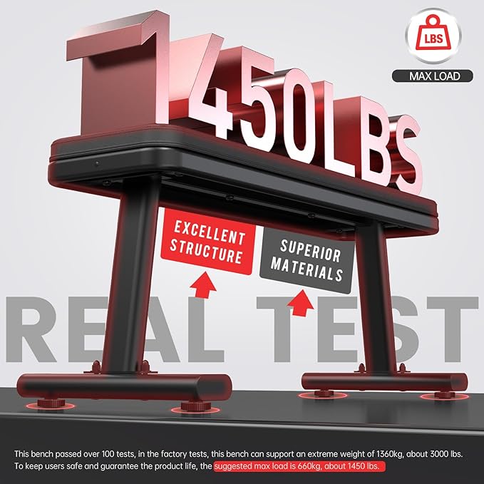 - 【 Real Test Max Load 1450LBS】PASYOU Flat Weight Bench is constructed with sturdy and thick steel tubes. This workout bench has passed 100 rigorous tests, demonstrating its remarkable ability to support weights of up to 1360kg, which is approximately 3000lbs. To ensure user safety and product longevity, the recommended maximum load capacity is 660kg, roughly equivalent to 1450lbs,which is much sturdy enough for most users.