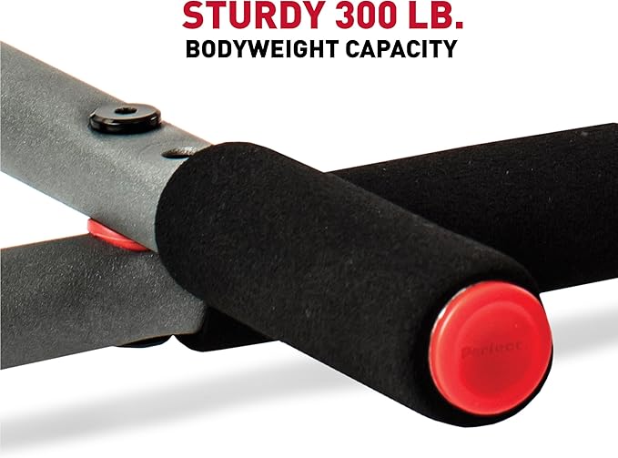 - Wide grip curved ergonomic handles offer three grip options for wide, close, and hammer grip pull-ups; padded handles ensure comfort for sit-ups, pushups, and dips