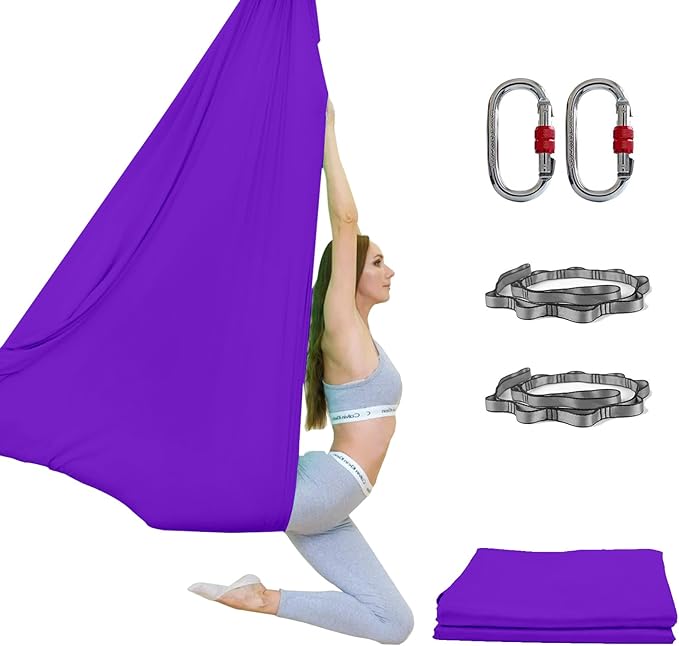 - Complete Arial Yoga Set- Our yoga trapeze swing comes with everything you need to get started, including 2* 25KN steel screw-lock carabiners, 2* polyester daisy chains, 1* yoga cloth(5.5 yards x 3 yards), 1* instruction manual