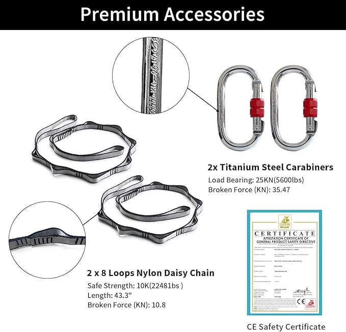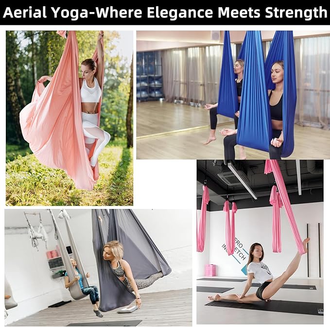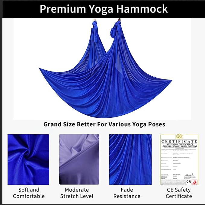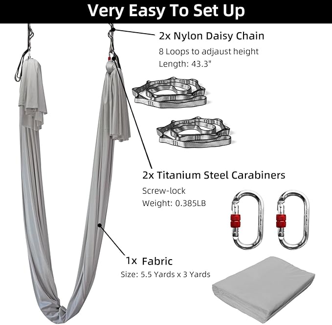 - Complete Aerial Yoga Kit- Our aerial hammock comes with everything you need to get started, including 2* 25KN steel screw-lock carabiners, 2* polyester daisy chains, 1* yoga cloth(5.5 yards x 3 yards), 1* instruction manual