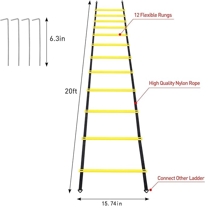 - 【SPORTS TRAINING SET】: This agility ladder kit includes an 12 Rung 20ft Agility Ladder, 12 Yellow Disc Cones, 1 Resistance Parachute, 4 Steel Stakes and a Drawstring Bag. Everything needed is ready for Improve fitness, agility, speed, vertical jump, and explosiveness.