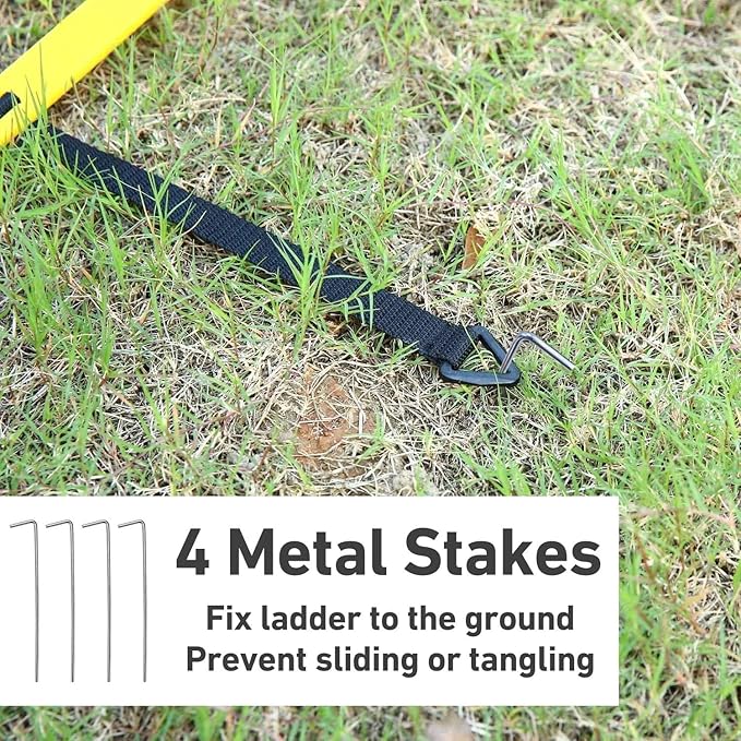 - 【AGILITY LADDER】: The agility ladder is adopted environmental PP material, which is pressure-resistant and anti-crack. Distance between rungs can be adjusted to fit your training scenario. Use the included steel stakes to keep it in place. The ladder with 12 rungs is 20’ Long.
