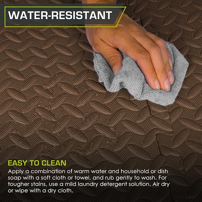 - Versatile – The water-resistant, noise-reducing design is easy-to-clean, great for indoor purposes like in garages as a protector, gyms, a home fitness room, or even children’s play areas as a playmat.