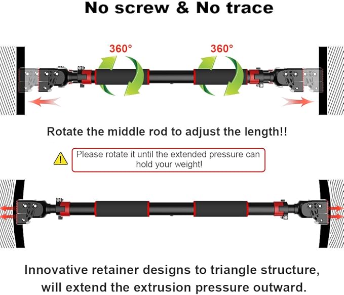 - ✿【NO Screws & NO Drilling】Setting up our pull-up bar takes only minutes to place on the door frame. The HANDSONIC pull-up bar is designed with two anti-skid devices on both sides. Simply rotate the pole and press it against the door frame. The doorway pull-up bar firmly sticks on the wall. The harder you pull on the chin-up bar, the more stability the bar will possess. The maximum weight capacity of the pull-up bar is 440 lbs. The pull up bar fits door frames between 28.7"-36.2".