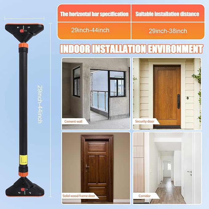 - 💪【ADJUSTABLE PULL UP BARS】Door frame pull up bar adjustable length for easy fitting in most of door frame between 29"- 38"(74cm-96cm). It can be installed in any gement walls, security doors, solid wood doors, corridors but not including fragile door frames, glass doorframe, hollowed doorframe, ceramic tile wall, Fragile Wall. Suitable for standard doorway, perfect for home, garage or office use.