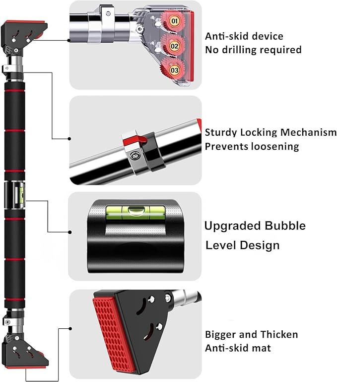 - 💪【NO Marks Left On Doors】Using a soft anti-skid pad on each side of the pull-up bar, the anti-skid material of the chin-up bar prevents the bar from suddenly falling off. Our pull-up bar features a locking mechanism made of stainless steel that prevents the pull-up bar from rotating during use. The locking mechanism ensures safety.