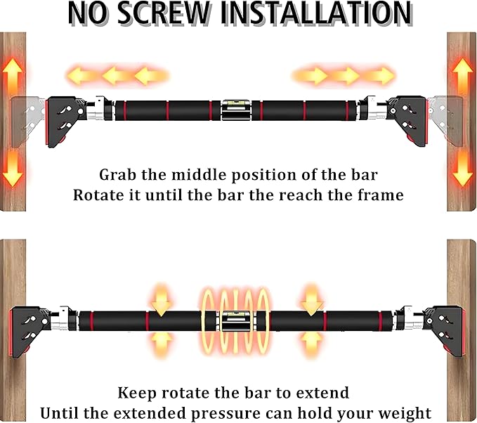- 💪【NO Marks Left On Doors】Using a soft anti-skid pad on each side of the pull-up bar, the anti-skid material of the chin-up bar prevents the bar from suddenly falling off. Our pull-up bar features a locking mechanism made of stainless steel that prevents the pull-up bar from rotating during use. The locking mechanism ensures safety.