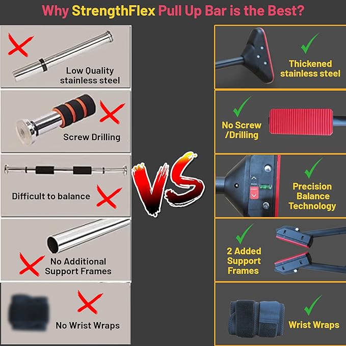 - 🔧 ADJUSTABLE FIT: Our adjustable pull up bar can be customized to fit your space. Ideal for any door frame, it's the perfect at home pull up bar. Whether you need an extra wide pull up bar or a smaller doorway pull up bar no screws, Strength Flex has got you covered.