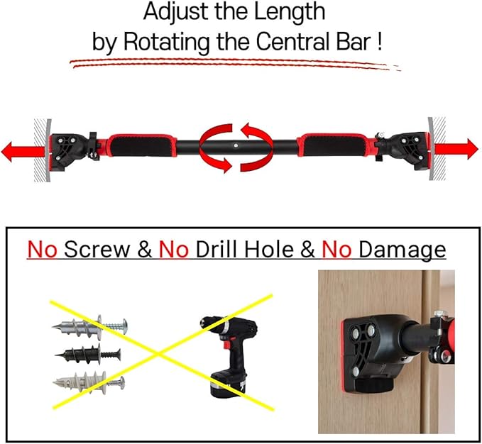 • 1. 【Fixed without Screw/Hole on the Doorway】 - Minimize door damage with pressure distribution mechanism. If there is the right wall space, you can install this pull up bar anywhere without door frame damage.