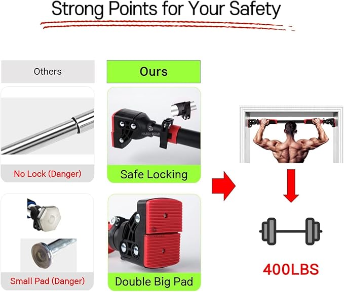 • 2. 【Safe Use with Thick Frame and Safe Locking】 - Since safe lock prevents the pull up bar from being loosened, you can use it more safely than other products. The thick frame can withstand weights of up to 400lbs.