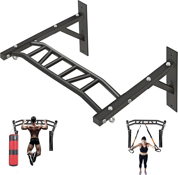 • 【Easy Installation & Space-Saving】 — The 'wall mounted pull up bar' is 48" wide and mounts directly to your wall stud at 48 inches (fitting both 16" and 24" studs) for both wood and concrete applications. Its up-side-down support bracket design allows for better wall clearance