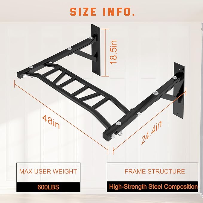 - 【Easy Installation & Space-Saving】 — The 'wall mounted pull up bar' is 48" wide and mounts directly to your wall stud at 48 inches (fitting both 16" and 24" studs) for both wood and concrete applications. Its up-side-down support bracket design allows for better wall clearance