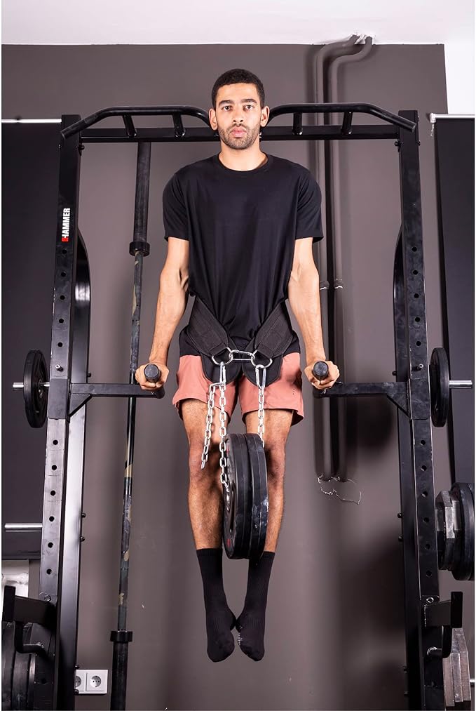 - ✅ EXTREMELY LOADABLE FOR HIGH ADDITIONAL WEIGHTS: The dip belt is extremely heavy-duty due to the high-quality processed and durable nylon fabric and has been tested for loads up to 250 kg. Additional weights can be threaded onto the steel chain and attached to the D-hooks of the Dip Belt with the extra strong steel carabiners.