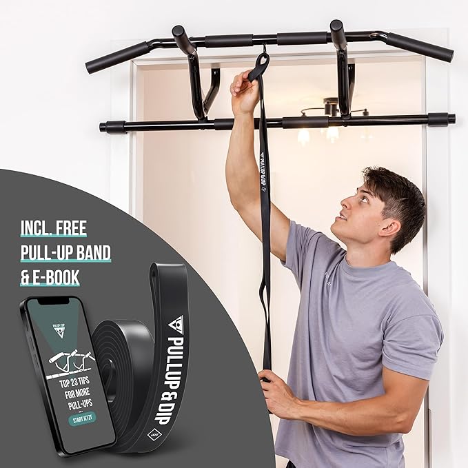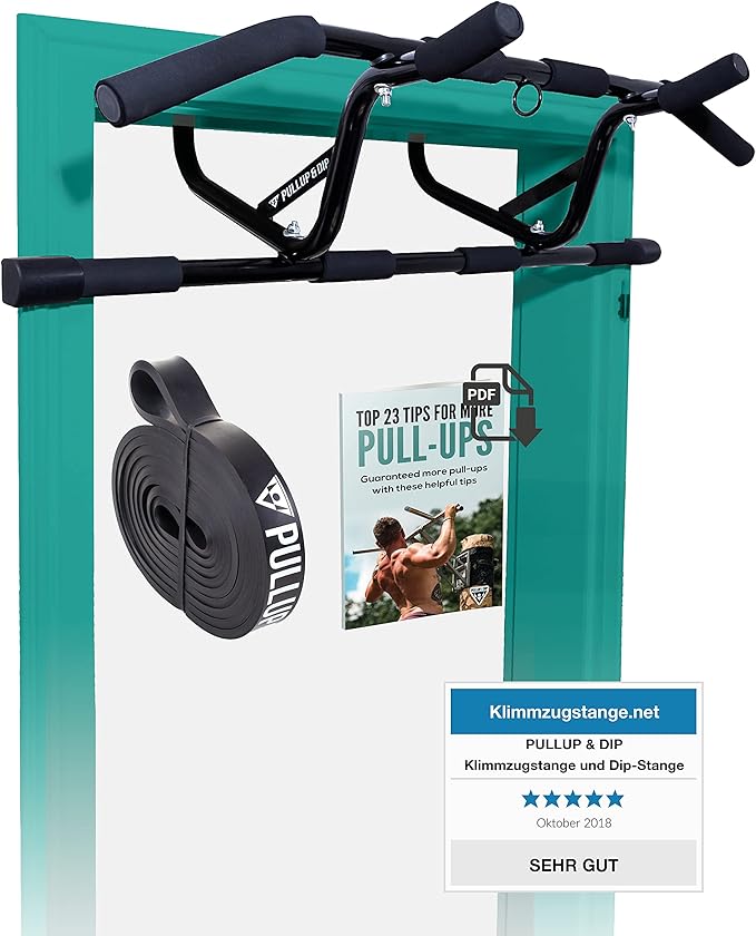 - ✅ INCLUDED PULL-UP BAND, EBOOK & ANTI SLIP HANDLES: Also included is a pull-up band (strength: light) as support for pull-ups or for numerous other exercises worth 14.90$ as well as our popular eBook "23 Tips for more Pull-Ups". The anti-slip foam covers offer you a perfect grip even with sweaty hands and prevent ugly corneal formation.
