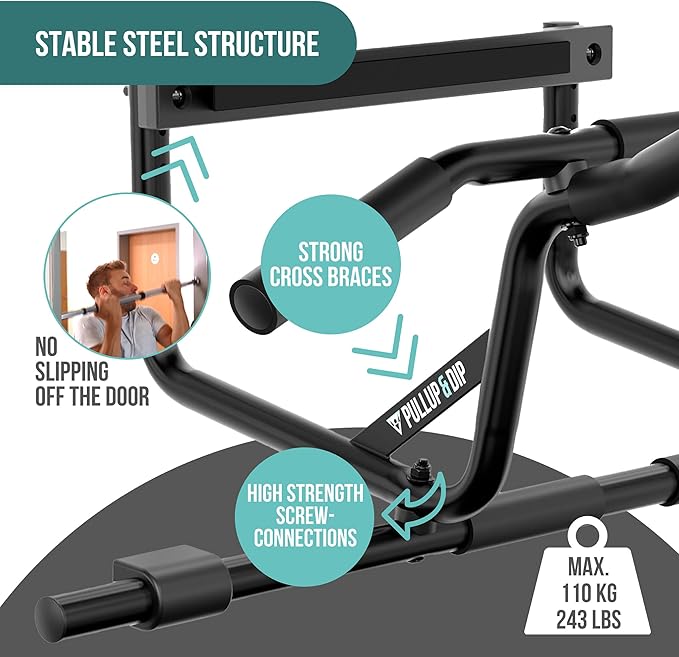 - ✅ HIGH SAFETY: The reinforced construction with cross bars and high-strength screw connections ensures maximum stability and a safe training without wobbling or slipping. Suitable for door frames with door openings between 25 – 37 inches (65 -95 cm) and a door frame depth of 6 – 10 inches (15 - 23 cm). The 3-step adjustable holder allows different heights. Width: 39 in, weight: 8.7 lbs (4.2 kg). Can carry up to 240 lbs (110 kg).