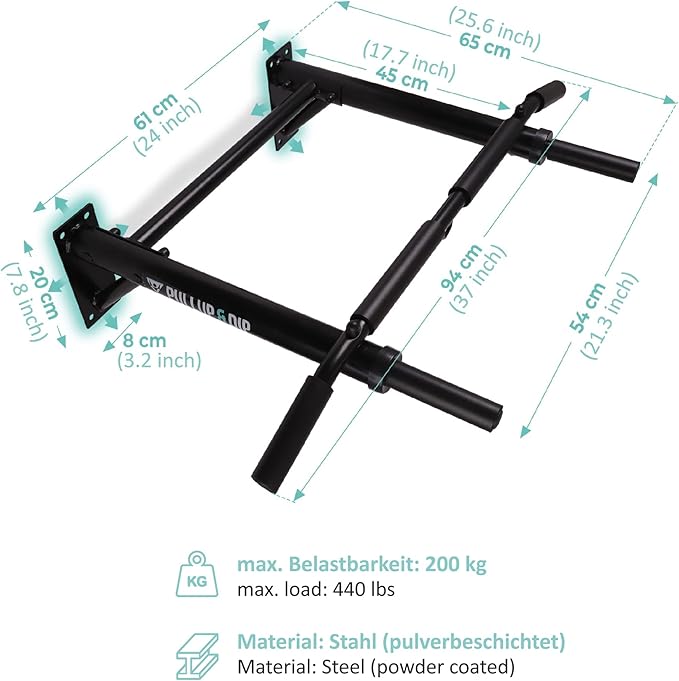 - ✅ EXTREME STABILITY: The wall mounted pull-up bar offers extreme stability thanks to the wall mounting and the steel construction with V- and cross struts, so that you can easily load it with up to 200 kg (440 lbs). Includes 8 extremely sturdy screws + heavy-duty dowels for quick and secure wall mounting.
