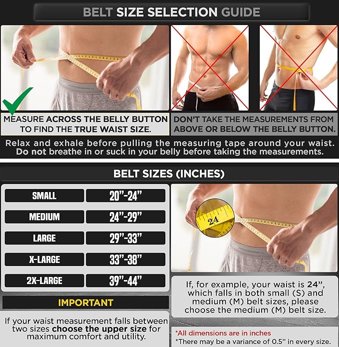- DO NOT TRUST YOUR PANT SIZE – S (20”-24”), M (24”-29”), L (29”-33”), XL (33”-38”), 2XL (38”-43”), 3XL (43”-48”). Please ensure that you measure your size ACCORDING TO THE SIZE CHART AND THE MEASURING INSTRUCTIONS provided in the size chart. Measure around your lower back and across your belly button to find your TRUE BELT SIZE. Measurements taken at pant size would result in WRONG BELT SIZE. If your waist size falls between two sizes, please CHOOSE THE UPPER SIZE for maximum utility.