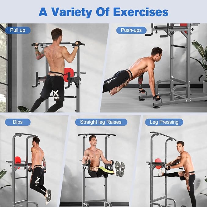 - 【Multifunction】This multi-function dip station for your home gym supports A Variety Of Exercise routines, including bodyweight rows, vertical knee raises,leg raises, and tricep dips. It helps you build triceps, chest, and shoulder muscles along with incredible upper body strength.Suitable for all fitness and strength-building workouts, also serves as a pull-up rack, leg lift machine, and pull-up dip station.