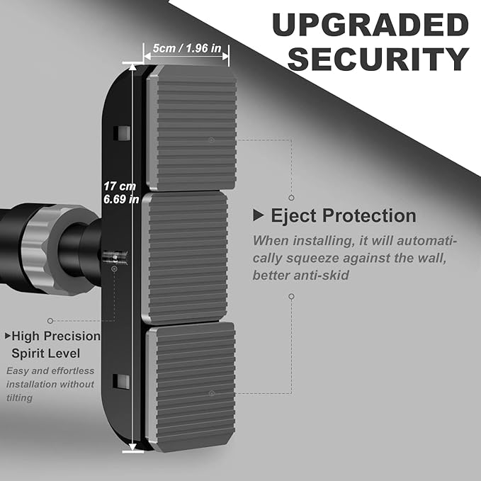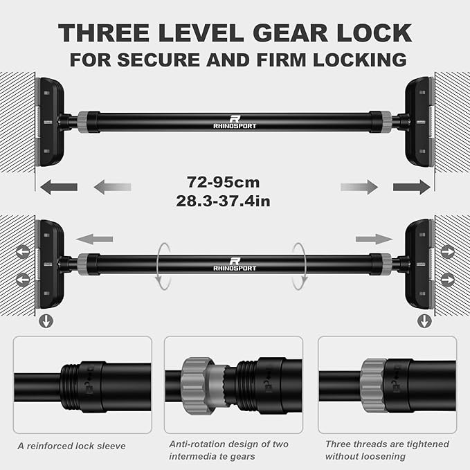 - 【Upgraded Security - Eject Protection】The two ends of this Rhinosport pull up bar are our original design of the spring automatic extrusion setting. When the gravity presses down, the upper and lower springs automatically squeeze against the wall to achieve a non-slip protection effect