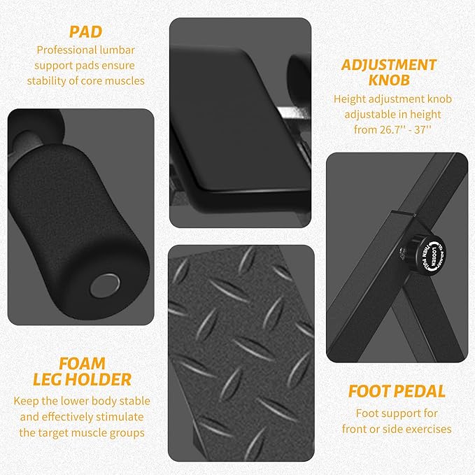 • Durable Construction – Crafted from high-strength carbon steel with an anti-abrasive coating, this hyperextension bench offers cushioned support and foot pads for comfort. It supports up to 245 pounds, ensuring long-lasting durability in your home gym