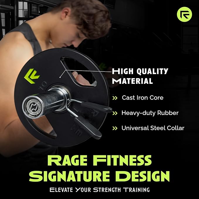 - RAGE SIGNATURE DESIGN: Rage Cast Iron Weight Plates present a fresh take on foundational gym equipment, featuring a revolutionary design. These rubber plates add a touch of style with a black finish, maintaining functionality and performance.