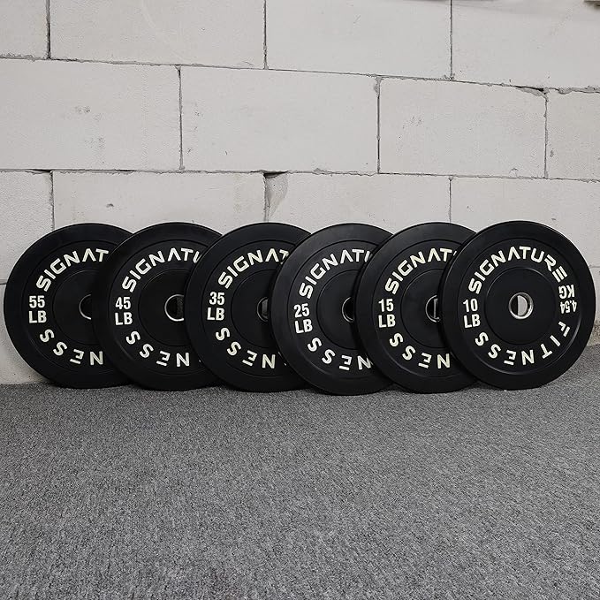 - 🌟 100% VIRGIN RUBBER - LOW ODOR AND BOUNCE 🌟 - Signature Fitness Bumper Plates contain NO recycled rubber. This means low to no odor, guaranteed durability, and low "dead" bounce for safety.
